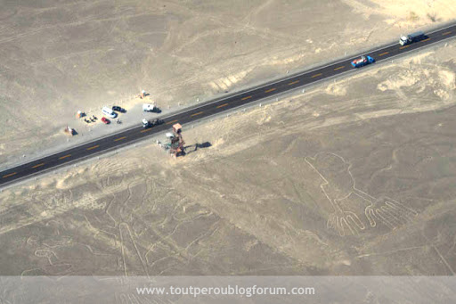 Dans cette zone désertique du Pérou, il existe sur la Panaméricaine, au niveau du kilomètre 425, un mirador qui permet d’apercevoir 2 des lignes (les mains et l’arbre), mais la vue terrestre ne vaut pas vraiment le survol.